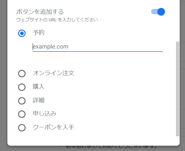 「ボタンを追加する」をONにすると、オンライン注文/購入/詳細/申し込み/クーポンを入手、いずれかのボタンを選択でき、それに応じたURLリンクでお客様をWEBページに誘導することが可能です。