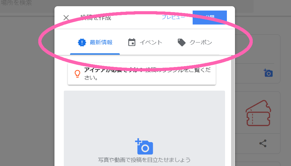 投稿のポップアップ画面部に「最新情報」「イベント」「クーポン」3つのタブが用意されています。